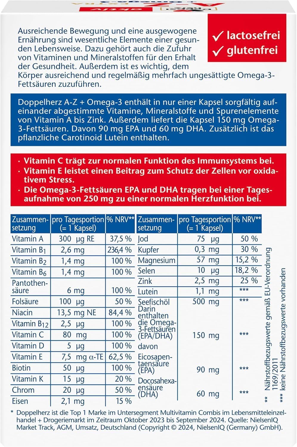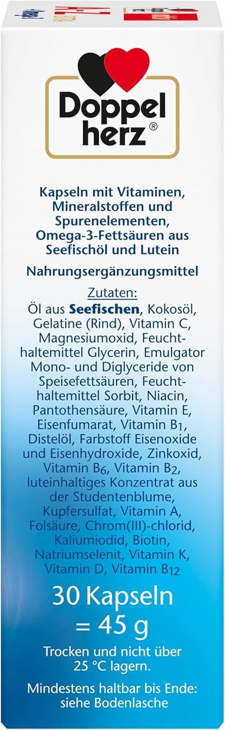 Doppelherz aktiv A-Z + Omega-3 Extra contains carefully coordinated vitamins, minerals and trace elements. Vitamins A, C and D as well as the trace elements zinc and selenium contribute to the normal functioning of the immune system. Vitamin B12 contributes to the reduction of fatigue and fatigue. Vitamin B1, B6 and B12 contribute to normal energy metabolism.