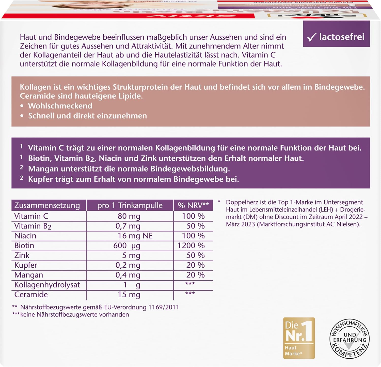 Skin and connective tissue play a central role in our appearance and are often considered indicators of health and attractiveness. With age, collagen levels in the skin decrease, leading to reduced elasticity. Doppelherz ®  active Collagen + Biotin + Ceramide drinking ampoules contain carefully selected vitamins and trace elements to support the maintenance of normal skin and connective tissue. Each ready-to-drink ampoule provides: